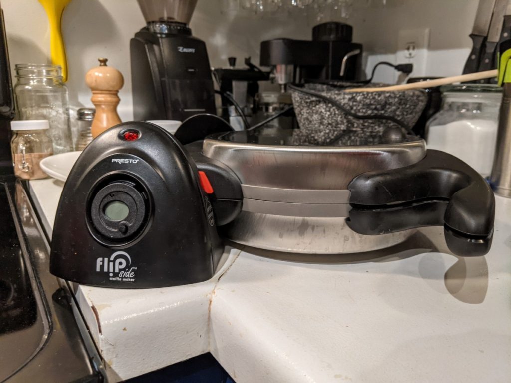 So around Christmastime, we got ourselves a little present: the Presto 03510 Ceramic FlipSide Belgian Waffle Maker. In addition to the obvious added convenience of it being electric, it also makes bigger waffles in the same time (or less).